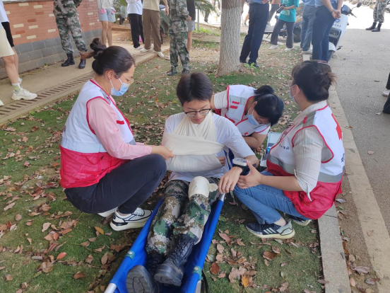 “发现伤员左前臂开放性创伤,立即止血包扎固定!”——演练现场,红会师资严格遵循应急救护规范,对模拟“擦伤”、“骨折”的伤员进行分级处置,重点演示了加压止血、骨折部位固定等技能。李金老师边操作边讲解,将急救知识融入救援行动。一名参与演练的学生表示:“看到‘伤员’出血时很紧张,但老师们的专业操作让我记住了急救要点,这样的演练比课堂更生动。