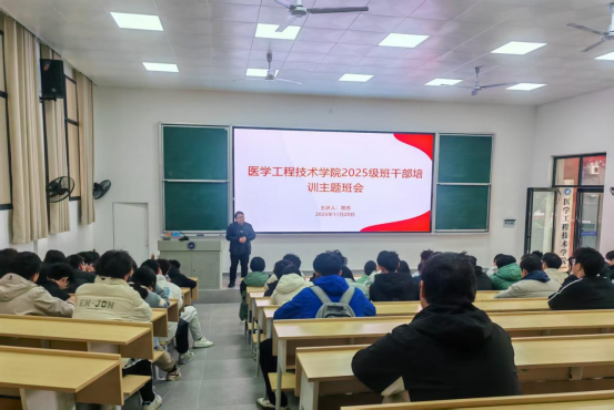 在电教楼105教室举办2025级班干部培训会,学办主任易苏担任主讲,全体辅导员及各班班干部共同参与。