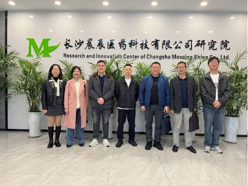 调研团队首先抵达长沙晨辰医药科技有限公司,在公司负责人的陪同下,参观了合成实验室、分析实验室及产物分离提纯实验室,详细了解了企业在药物研发、科技创新及质量管理等方面的先进经验。随后的座谈交流中,副总经理罗慧超、郝春霖博士出席,双方围绕校企合作模式、人才联合培养、科研项目共建及人员招聘需求等议题进行了深入探讨,并就进一步拓展合作领域、推动资源共享达成初步共识。